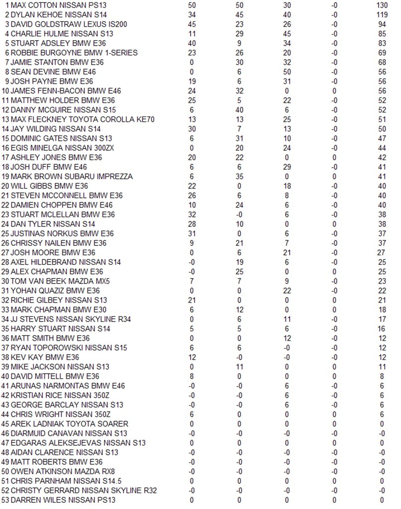 As you can see, a wide variety of cars are listed, some not your average weapon of choice, but that is where this championship shines. It is so varied that sometime it is not just about the driver but the car, the powerplant and indeed the performance of that day. Certainly putting an MX5 up against a S15 isn`t a match that you will see in Formula D, but this is what makes the BDC unique. It takes all people from all backgrounds and all financial areas and throws it all up in the air. Where they fall is another story, but it does work.