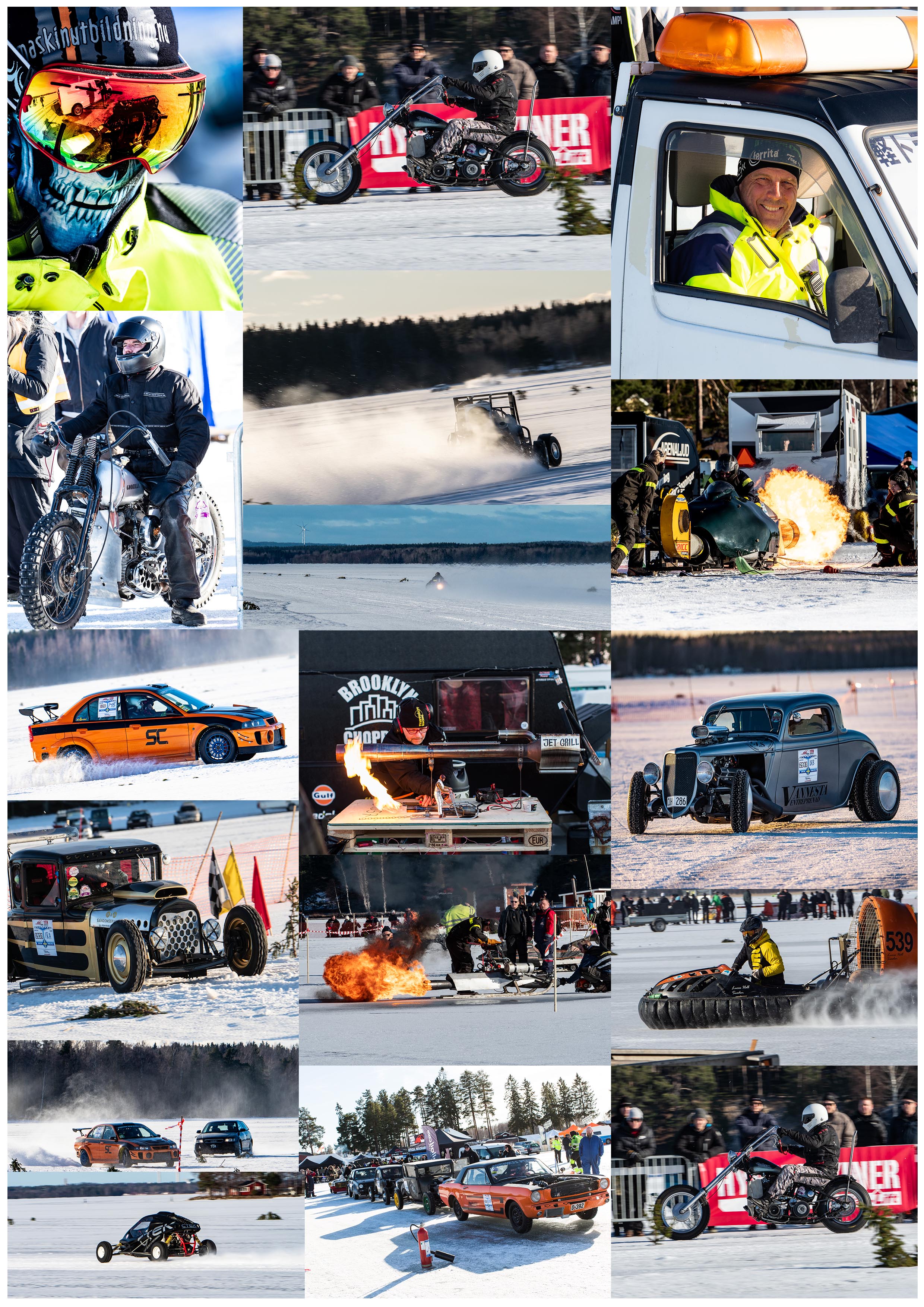 Situated in the heart of Sweden lies Årsunda Strandbad camping site. Bound by snow and ice at this time of year it seems a inhospitable place for an event let alone a speed weekend. Never the less here they are all forms of transport from cars to snowmobiles with a variety of powersources, internal combustion to pulse jet and four wheels to two. All seem at home with the lack of grip but spiked tyres make up for that, and lack of tyres too. That cushion of air running no grip but then again no friction. Is this a good thing? They seem to think so. Certainly fire and ice here.
